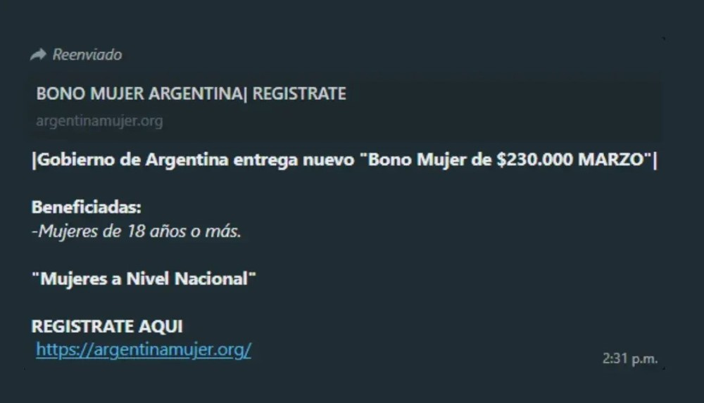 En los últimos días se viralizó el “Bono Mujer”, una nueva estafa en las redes sociales sobre el pago de un beneficio para las mujeres de 230 mil pesos y que se publicita con la imagen del presidente Javier Milei.