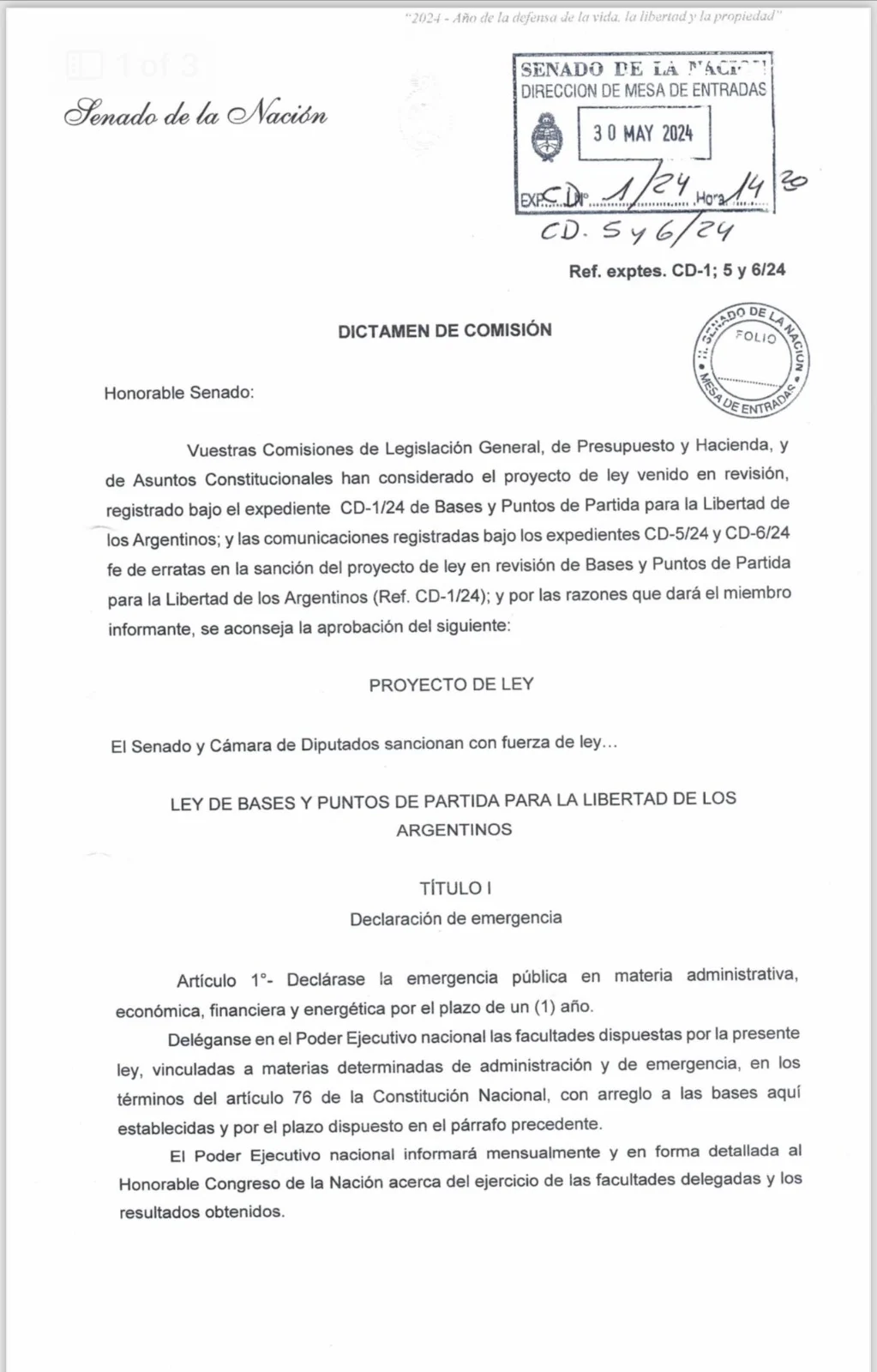 Ayer se había dejado trascender que estaban las firmas para el dictamen de Ley Bases, luego de arduas negociaciones que involucraron al jefe de Gabinete, Guillermo Francos. Había tres legisladores apuntados a los que lograron convencer. Una es la senadora del PRO, Guadalupe Tagliaferri. El otro es el santacruceño José María Carambia, que logró el incremento del régimen especial de Ganancias para la Patagonia, pero también un aumento en la cuota de regalías del 3% al 5% para la actividad minera.